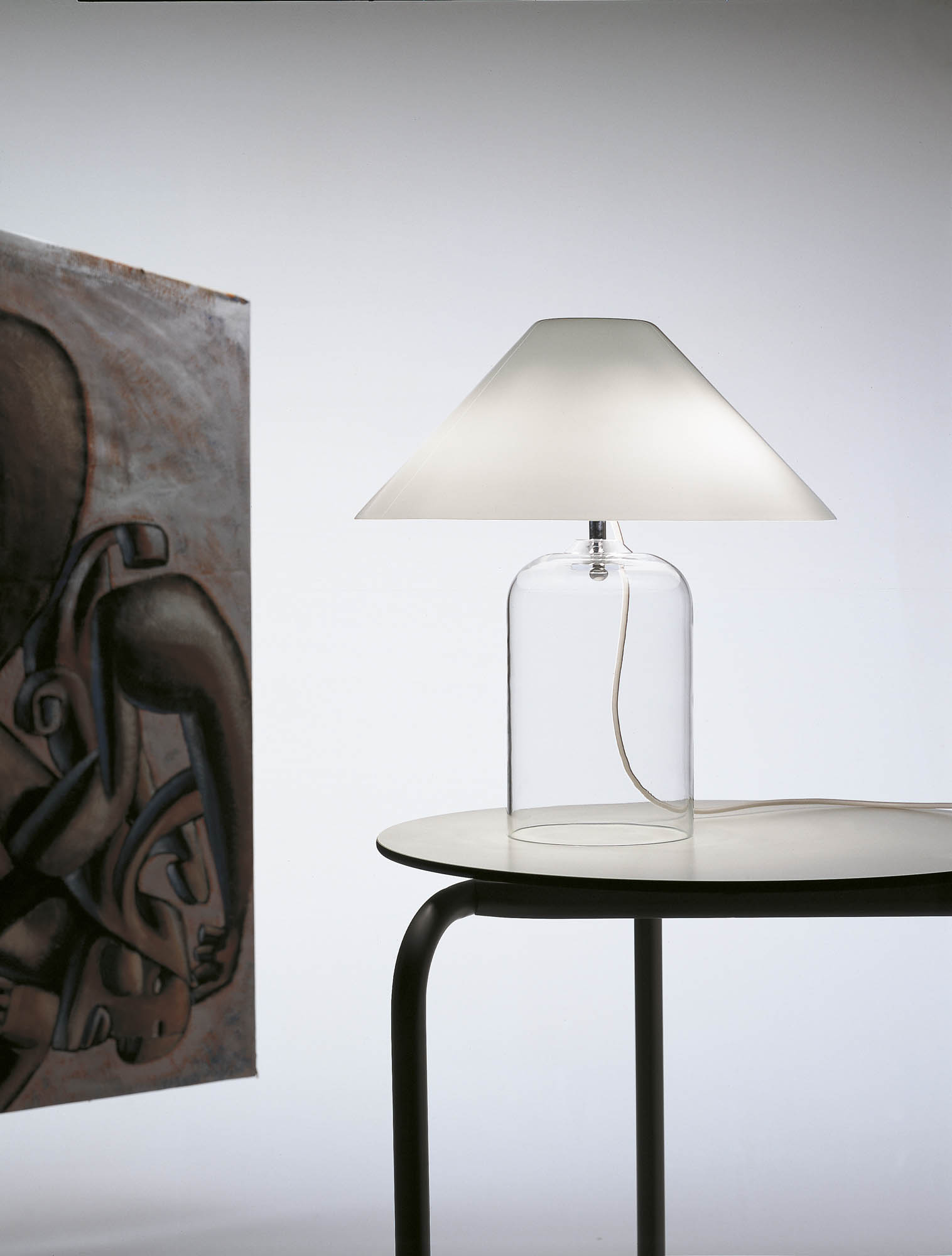 Table lamp with a cone-shaped white blown glass shade and a cylindrical transparent crystal base.